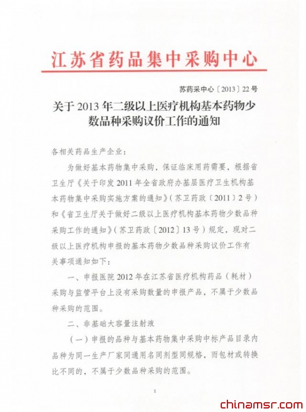 2013年江苏省关于二级以上医疗机构基本药物少数品种采购议价工作的通知