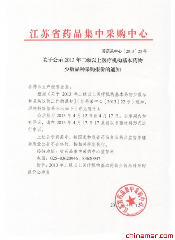 江苏省关于公示2013年二级以上医疗机构基本药物少数品种采购报价的通知
