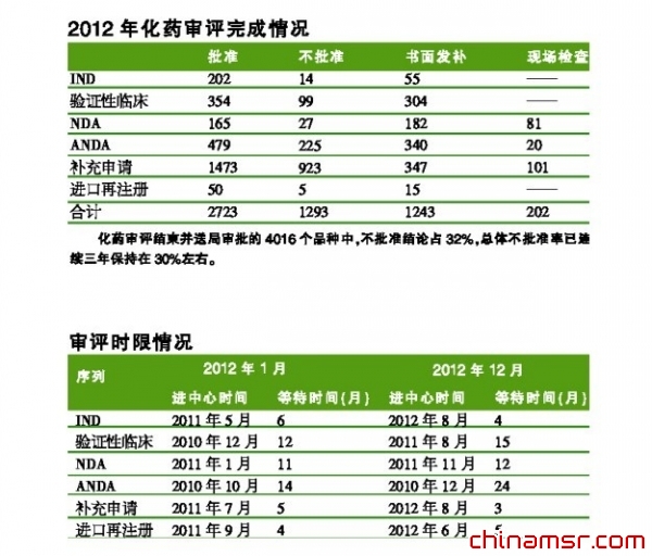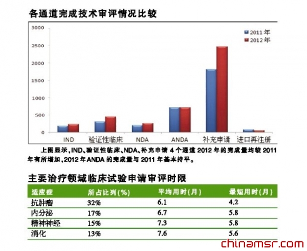2012年,举CDE之力,力保创新药临床试验申请的审评,使审评等待时间略有缩短并基本维持在4个月左右;上市后补充申请的等待时间也从2012年初的5个月,降至2012年底的3个月;但是,ANDA的等待时间从年初的14个月延长至年底的24个月。同时,NDA和验证性临床试验申请的等待审评时间也有所延长。