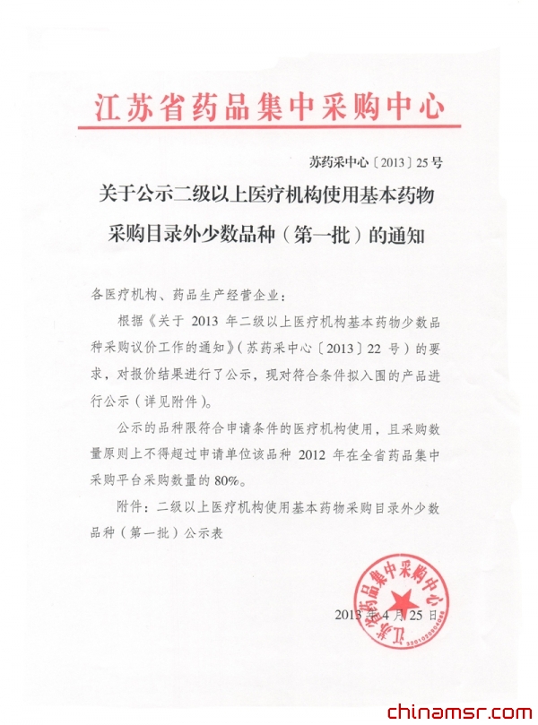 2013年江苏省关于公示二级以上医疗机构使用基本药物采购目录外少数品种(第一批)的通知