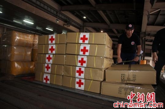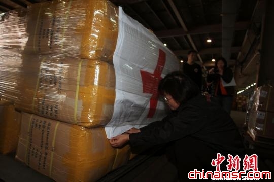图为台湾红十字组织负责人王清峰在检视赈灾物资。 董会峰 摄