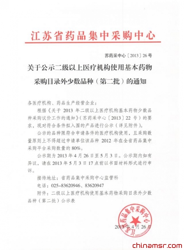 2013年江苏省关于公示二级以上医疗机构使用基本药物采购目录外少数品种(第二批)的通知