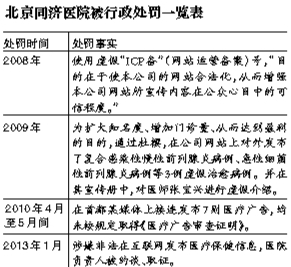 记者发现,北京同济医院成立五年多时间里,2008年至2010年,因违规发布医疗广告,曾四次被北京市东城区卫生局给予“警告”行政处罚。2008年3月,曾被北京市卫生局撤销《医疗广告审查证明》,被责令一年内不得发布医疗广告。然而,在接受调查的同一时段,该院涉嫌违法违规的广告宣传仍势头不减。