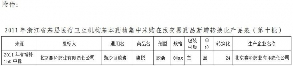 根据《2011年浙江省基层医疗卫生机构基本药物集中采购实施方案》的规定和医疗卫生机构临床治疗的需要,经审核,现公布在线交易药品新增转换比(详见附件)。其统一采购价格和集中采购药品零售价已由省物价局公布,新增转换比产品的配送方案等与原在线交易药品一致。