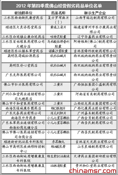 本报讯(文/表记者赵冬芹)昨日,广东省食品药品监督管理局公布了《2012年第四季度广东省药品质量公告》。抽检结果显示,佛山19家药品经营单位(或医疗机构)进入省药品质量公告“黑名单”。