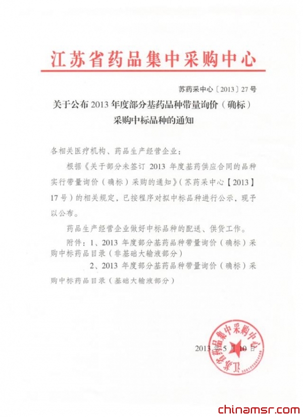 江苏省关于公布2013年部分基药品种带量询价(确标)采购中标品种的通知