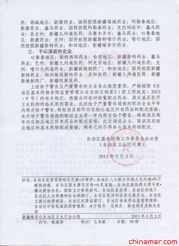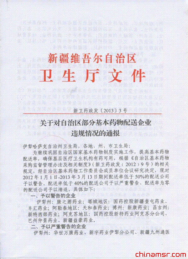 2013年新疆维吾尔族自治区关于对自治区部分基本药物配送企业违规情况的通报