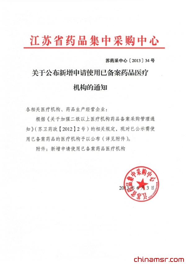 2013年江苏省关于公布新增申请使用已备案药品医疗机构的通知 (百度虫医药商务网)