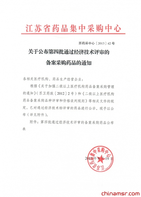 2013年江苏关于公布第四批通过经济技术评审的备案采购药品的通知