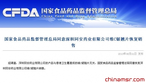 国家药监总局网站今晚公告称,经调查,深圳同安药业有限公司的产品与香港卫生署通报的维C银翘片无关,国家食品药品监督管理总局同意恢复深圳同安药业有限公司维C银翘片销售。