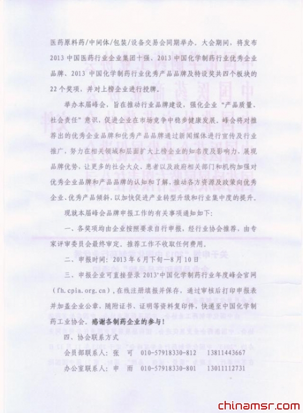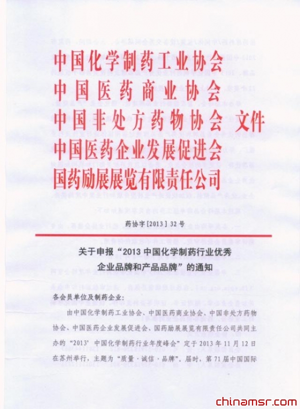 中国化学制药工业协会关于申报“2013中国化学制药行业优秀企业品牌和产品品牌”的通知 (百度虫医药商务网)