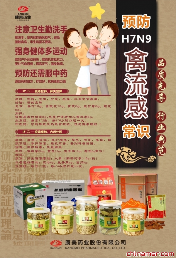 抓住流行病治疗用药和季节性用药,通过醒目的相关陈列与POP,引导顾客自主购买,也是必不可少的。比如近期开始在全国范围流行的H7N9禽流感。就得设置器防止专区、把药品、保健品,抗病毒药物、提升免疫力药物等组合引导语陈列。同时还必须有比较明显的手绘挥着印刷体的海报予以预告,比如康美提供的海报: