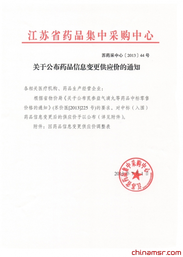 2013年江苏关于公布药品信息变更供应价的的通知 (百度虫医药商务网)
