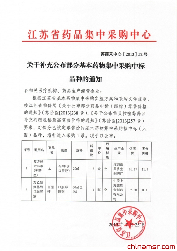 2013年江苏省关于补充公布部分基本药物集中采购中标品种的通知 (百度虫医药商务网)