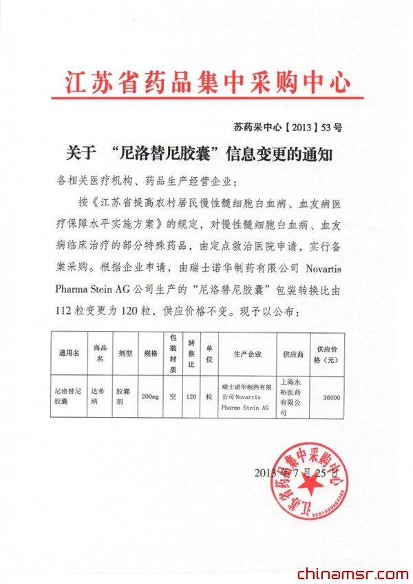 2013年江苏省关于“尼洛替尼胶囊”信息变更的通知 (百度虫医药商务网)