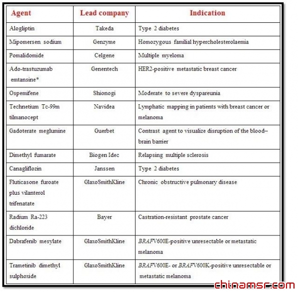 另外还有两个亮点新药,一个是强生旗下的Janssen药物公司的Canagliflozin,该药是在美国批准的第一个SGLT2抑制剂,SGLT2是一种钠依赖的葡萄糖转运蛋白, 所以Canagliflozin的适应症是2型糖尿病。值得一提的是该药最初由日本三菱旗下的田迈三菱制药(Mitsubishi Tanabe Pharma)研发,后转让给Janssen公司,另外一个是GSK的Trametinib,这个小分子化学药,是史上第一个靶向MEK(MAPK/ERK)激酶的新药。