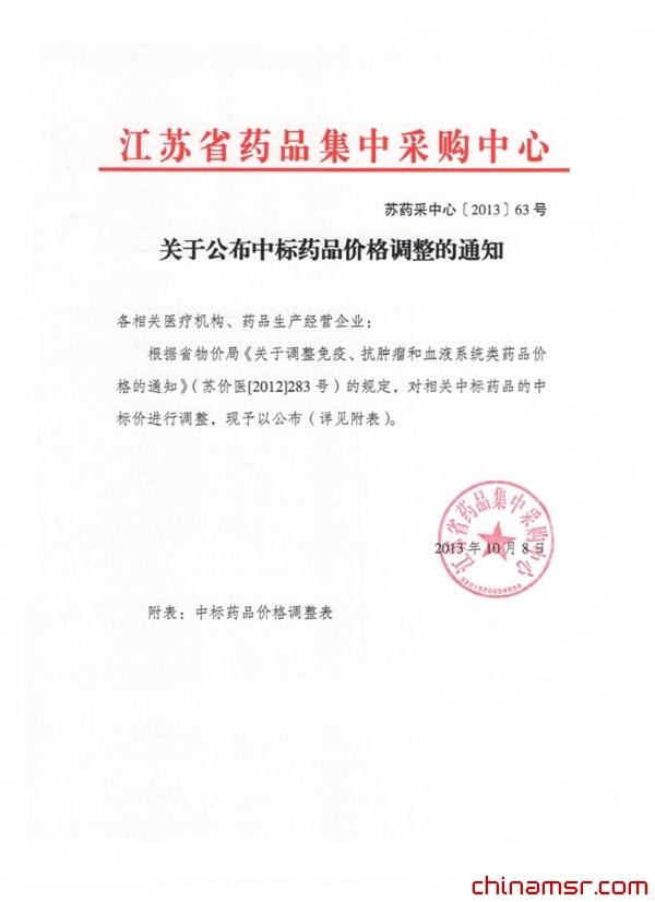 2013年江苏省关于公布中标药品价格调整的通知 (百度虫医药商务网)