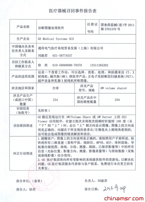 中国医药联盟10月9日讯 近日,由于GE Medical Systems SCS公司生产的诊断图像处理软件可能会造成图像的错误解读和误诊等原因,GE Medical Systems SCS公司对该产品进行主动召回。请各省、自治区、直辖市食品药品监督管理部门加强对此产品的监督管理。详细信息见“医疗器械召回”栏目。
