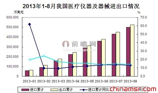 及器械进出口贸易持续向好,进出口总额达1025094万美元。其中,1-8月我国医疗仪器及器械出口额达524705.5万美元,同比增长14.20%;1-8月我国医疗仪器及器械进口总额达500388.5万美元,同比增长13.3%。由此可以看出,出口的总额及增长速度均大于进口。
