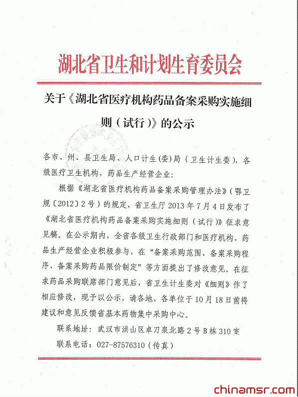 2013年湖北省关于《湖北省医疗机构药品备案采购实施细则(试行)》的公示 (百度虫医药商务网)