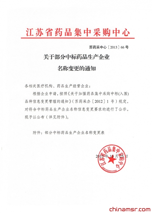 2013年江苏省关于部分中标药品生产企业名称变更的通知 (百度虫医药商务网)
