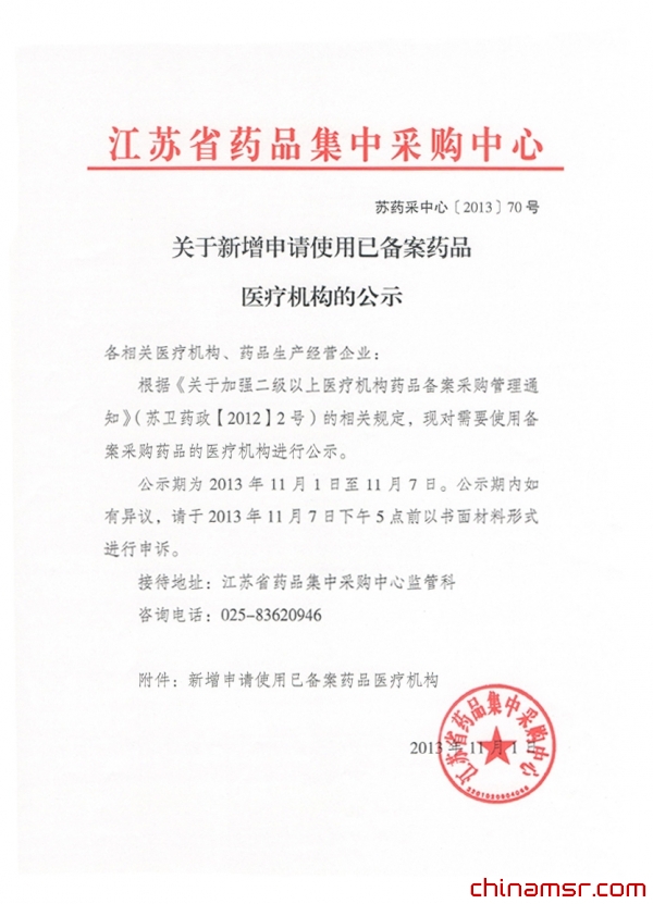 2013年江苏省关于新增申请使用已备案药品医疗机构的公示 (百度虫医药商务网)