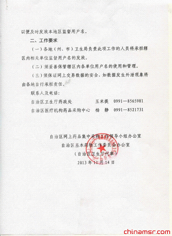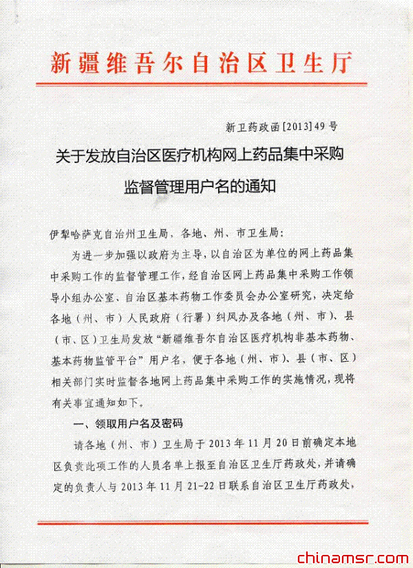 2013年新疆维吾尔自治区关于发放自治区医疗机构网上药品集中采购监督管理用户名的通知 (百度虫医药商务网)
