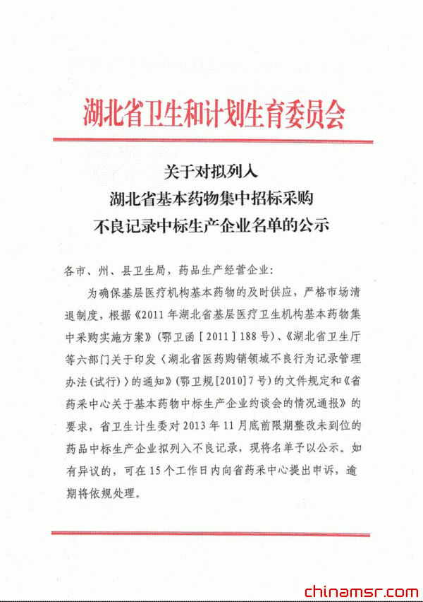 2013年湖北省关于对拟列入湖北省基本药物集中招标采购不良记录中标生产企业名单的公示