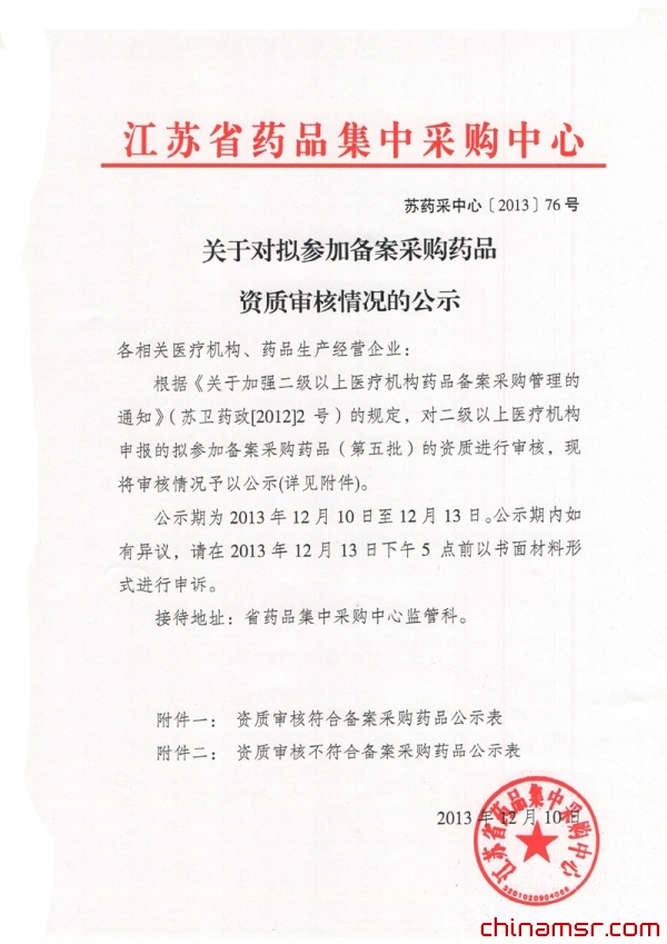 2013年江苏省关于对拟参加备案采购药品资质审核情况的公示