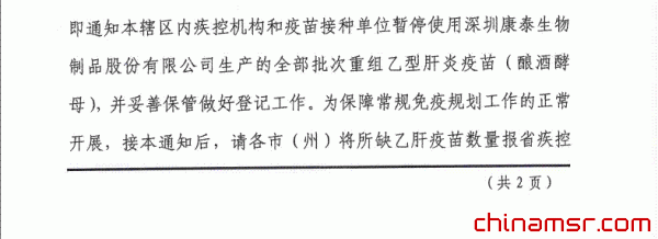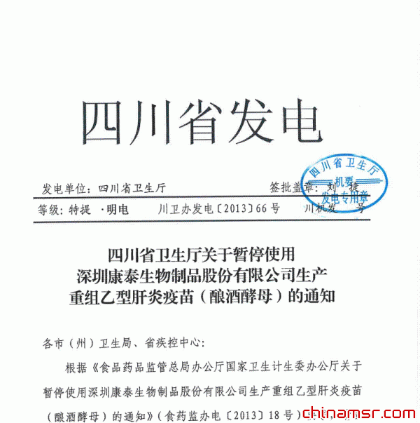 2013年四川省卫生厅关于暂停使用深圳康泰生物制品股份有限公司生产重组乙型肝炎疫苗(酿酒酵母)的通知 (百度虫医药商务网)