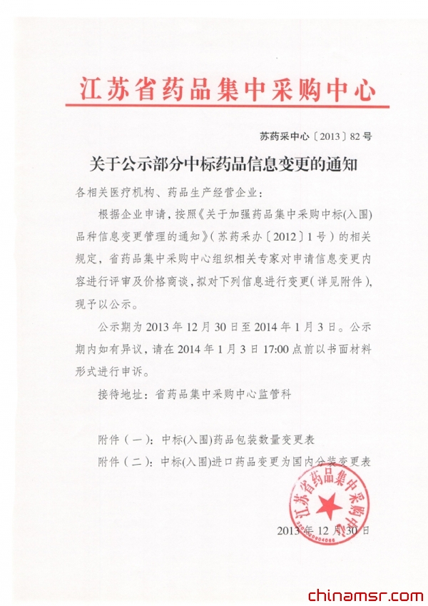 2013年江苏省关于公示部分中标药品信息变更的通知