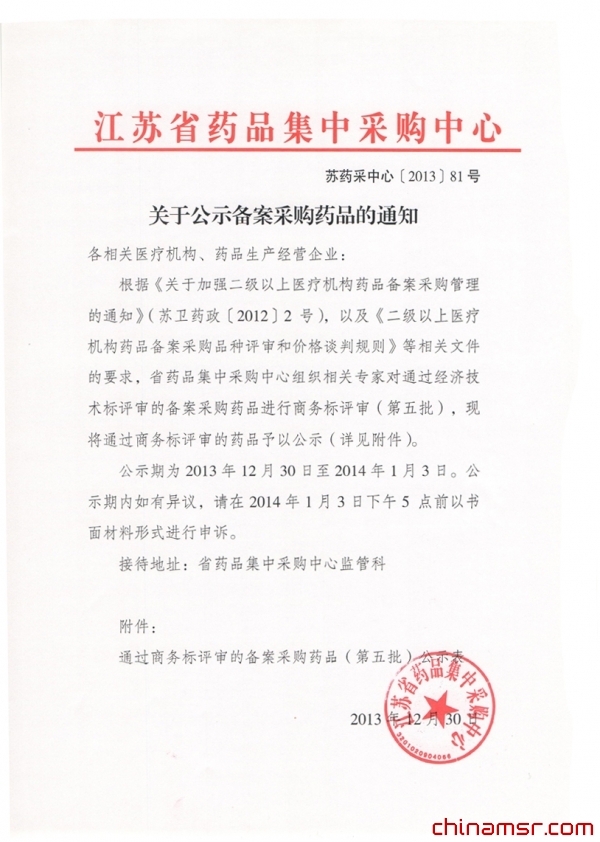 2013年江苏省关于公示备案采购药品的通知