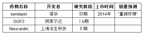 中国上海泽生科技开发有限公司现在也在测试用于治疗慢性心脏衰竭的神经调节蛋白候选药物Neucardin。该药的Ⅱ期临床试验已经在美国完成,并已在中国提交生产申请。该公司目前在美国注册了该药的Ⅲ期临床试验,但其Ⅱ期临床试验数据没有GGF2令人印象深刻。然而,该公司表示,Neucardin对678例慢性心脏衰竭患者的Ⅱ期数据表明,该药改善左室射血分数可比安慰剂提高3%~5%。GGf2和Neucardin未来销量难以预测,但可以肯定的是,任何候选药物如果显示具有改善心脏衰竭患者的症状和生存,都会具有不错的市场前景。