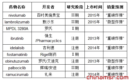 下表为癌症潜力新药品种(注:obinutuzumab于2013年11月1日获得FDA批准上市,ibrutinib于2013年11月13日获得FDA批准上市,“微型炸弹”:年销量超过4亿美元;“重磅炸弹”:年销量超过10亿美元;超级“重磅炸弹”:年销量过20亿美元;下同)