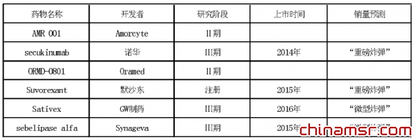 Synageva生物制药公司的sebelipase alfa用于治疗罕见疾病沃尔曼氏病,现已进入Ⅲ期临床试验阶段。患沃尔曼氏病的婴儿大部分无法存活1年以上,成人患者有腹部肿胀、肝脏肿大和严重的甚至危及生命的消化问题。sebelipase alfa将成为第一个获得批准用于治疗沃尔曼氏病的药物,FDA已经授予其罕见疾病药物、快速审批和“突破性疗法”认定资格。鉴于罕见疾病的定价环境,Synageva公司能够在此药上获得丰厚的回报。