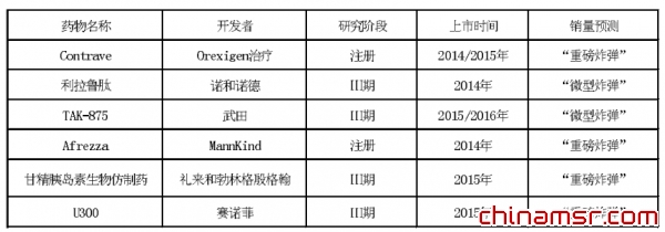 赛诺菲的重组甘精胰岛素U300,将于2014年上半年在美国和欧洲提交新药上市申请。和来得时相比,该产品的低血糖发生率更低,皮下注射量更小,而来得时将在2015年失去专利保护。作为全球最大的胰岛素厂家,诺和诺德希望能从赛诺菲手中夺回市场份额,但可能需要等到该公司长效胰岛素新药Tresiba于2016年在美国获得批准上市才可能实现这一愿望。