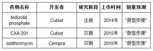 Cubist公司的另一个产品是CXA-201,用于治疗复杂性腹腔内感染和复杂性尿路感染,已进入Ⅲ期临床试验,如果试验结果不错,预计在今年年底提交上市申请。Aegis投资集团认为,CXA-201将在2015年初上市,2022年其销量将会达到7亿美元。CXA-201将面对治疗细菌的耐药广谱β-内酰胺类抗生素美罗培南的竞争。