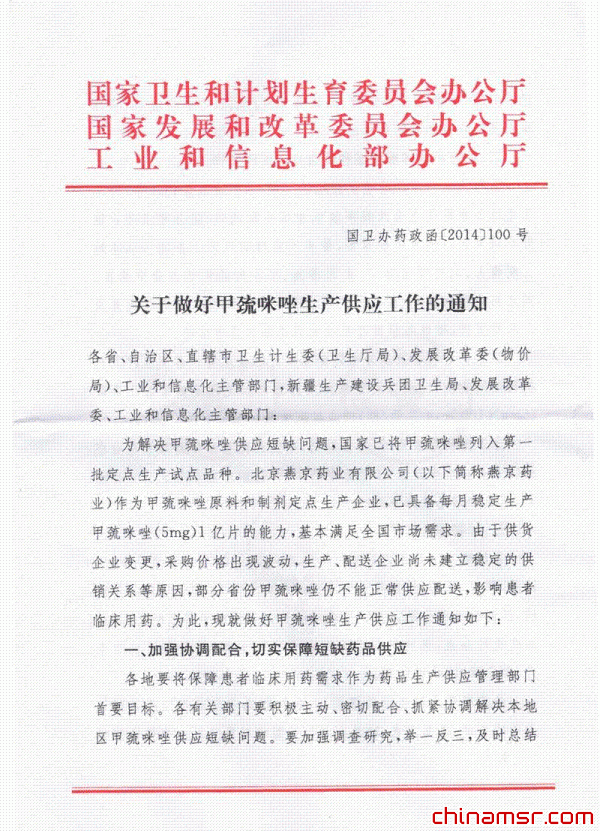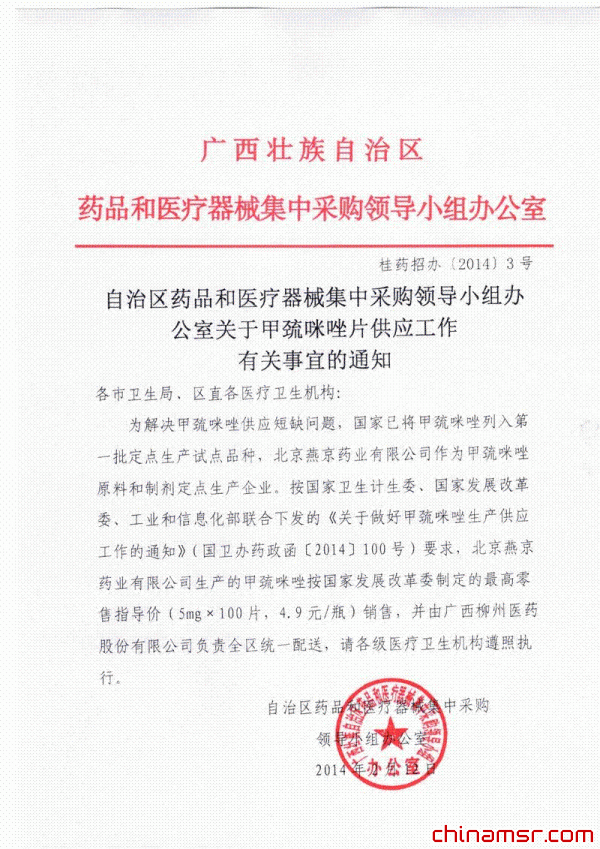2014年广西壮族自治区药品和医疗器械集中采购领导小组办公室关于甲巯咪唑片供应工作有关事宜的通知 (百度虫医药商务网)