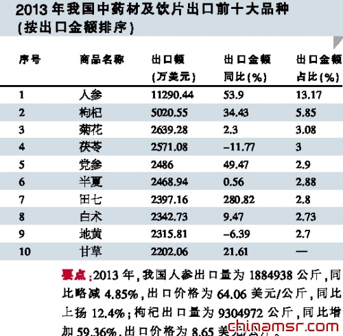 2013年地黄、田七、白术、杜仲和白芍等商品的出口数量也同比大幅增加,而地黄、菊花的出口价格同比大幅上扬。