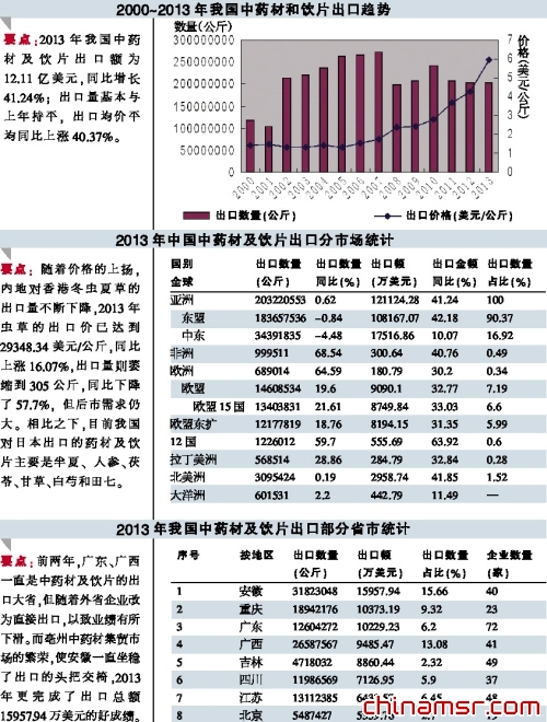 受世界各国刺激经济增长的政策影响,2013年,全球经济仍旧行进在缓慢复苏的道路上。中药材及饮片是我国中药出口中增长幅度最大的一个子行业。2013年,我国中药材及饮片出口额为12.11亿美元,同比增长41.24%;出口量基本与上年持平,出口均价平均同比上涨40.37%。