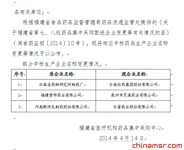 2014年福建省关于第七、八批药品集中采购部分中标企业名称变更的通知(五十三) (百度虫医药商务网)