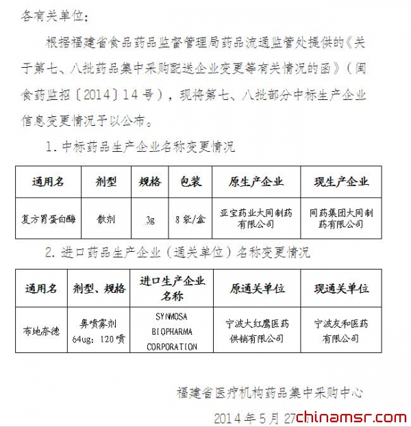 2014年福建省关于第七、八批药品集中采购部分中标企业名称变更的通知(五十七) (百度虫医药商务网)