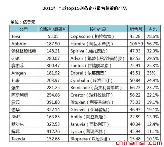 2013年全球top15制药企业的原研处方药收入平均有25%都来自销售额最高的单一品种,其中Teva和AbbVie对核心产品的依赖强度最为突出。尽管原研处方药在Teva整体业务中的份额还不到一半(47%),但是多发性硬化症药物Copaxone在Teva创新性处方药收入中的占比高达78.6%,Copaxone对Teva整体销售收入和利润率的表现都起着至关重要的作用。