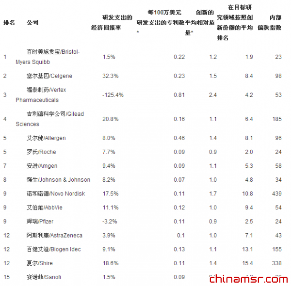 2.各大制药公司在研发方面每花费100万美元而申请的专利数量;只有在药物进入试验中期阶段,相关专利才计算在内,因为在此之后,有些公司补充申请专利,意在之后保护自己上市销售的产品。