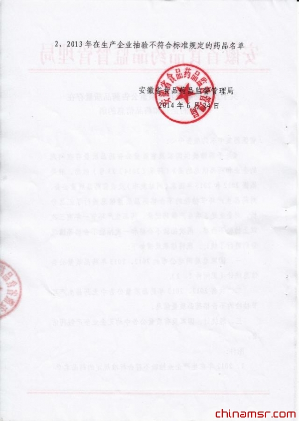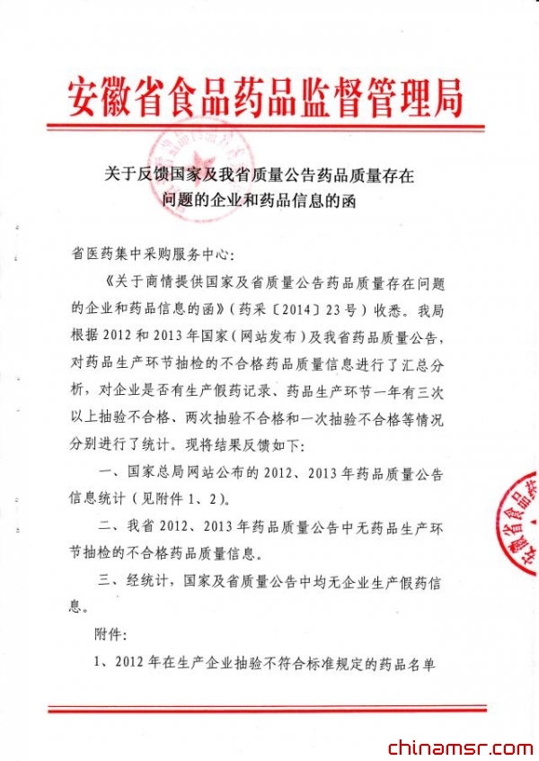 安徽省食品药品监督管理局关于反馈国家及我省质量公告药品质量存在问题的企业和药品信息的函 (百度虫医药商务网