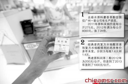 王小姐想买的痱子水,之前的零售价是5.1元/100毫升,价廉物美,但是王小姐奔波了五六家药房,都找不到这款药。药店工作人员给出的解释是:“我们也跟厂家联系过,厂家回复称,原料涨价,完全是亏本经营,所以没有办法生产。”之后,工作人员给王小姐推荐了一个可替代药品,但是价格高出不少,组合装的价格为26元。