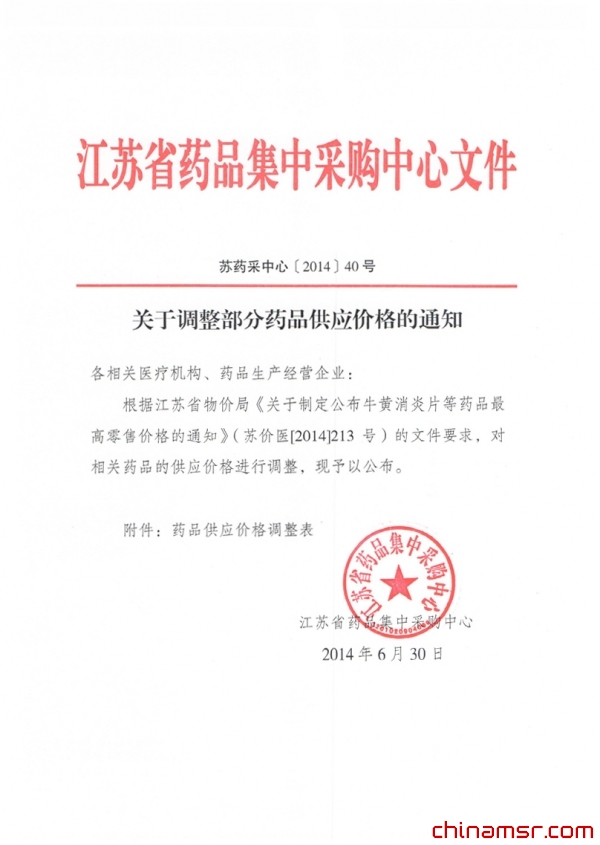 2014年江苏省关于调整部分药品供应价格的通知(20140630)