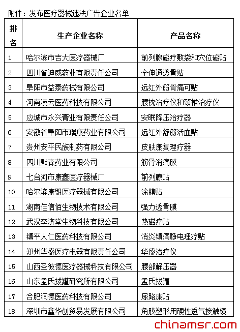2014年6月27日,国家食品药品监管总局稽查局召开会议,对全国18个发布严重违法医疗器械广告的企业进行行政告诫。