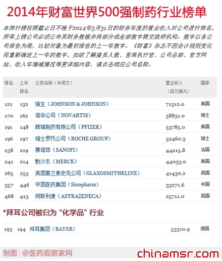 美国《财富》杂志7日发布2014年世界500强排行榜,沃尔玛、壳牌、中石化位列前3。在制药行业榜单中,具体为:强生121、诺华170、辉瑞191、罗氏196、赛诺菲238、默沙东241、葛兰素史克265、中国医药集团357、阿斯利康468;此外,拜耳公司位列193名,被归为化学品行业。