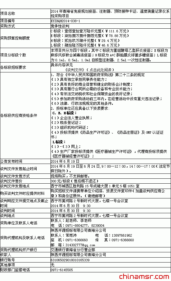 2014年青海省免疫规划疫苗、注射器、预防接种卡证、温度测量记录仪系统采购项目公告 (百度虫医药商务网)